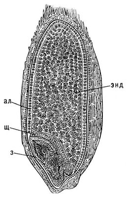 Злаки (Poaceae, или Gramineae), семейство однодольных растений. Однолетние, двулетние или многолетние травы, реже кустарниковидные или древовидные формы. Стебель Злаки, называемый соломиной, большей частью цилиндрический, иногда сжат с боков, прямостоячий, восходящий, полегающий или лежачий (и тогда часто укореняющийся в узлах); поперечными, большей частью вздутыми узлами соломина разделена на междоузлия, обычно внутри полые (кроме основания и верхней части соцветия), реже выполненные рыхлой тканью. Высота стебля от 1 см до десятков м; в странах с умеренным климатом чаще 0,3—1,2 м при диаметре 3—5 мм; у некоторых Злаки стебель одревесневает и достигает значительных размеров (у бамбуковых высотой до 40 м и диаметром 30 см). Для стебля Злаки характерен интеркалярный рост за счёт меристемы в нижней части междоузлия. Листья, отходящие от узлов стебля, очередные, обычно расположены двурядно и, как правило, состоят из влагалища, пластинки и язычка. Влагалище трубчатое, плотно охватывающее стебель, большей частью открытое, лишь изредка сросшееся (замкнутое); основание его обычно утолщено и образует заметное кольцевое утолщение — т. н. листовой, или влагалищный, узел. Пластинка листа узколинейная, линейная или линейно-ланцетная, лишь изредка широкая, обычно с параллельным жилкованием; нередко пластинка сложена вдоль или края её свёрнуты. Язычок — полупрозрачный плёнчатый вырост на границе между влагалищем и пластинкой; он цельный или рассеченный, иногда редуцированный до ряда волосков или ресничек, изредка отсутствует (рис. 1—2). Корневая система Злаки — чаще всего из многочисленных тонких придаточных корней, собранных в пучок (мочку); первичные корни рано отмирают. Корни многих луговых и степных Злаки часто располагаются лишь в верхнем горизонте почвы, у др. — уходят в почву на глубину 1—1,5 м и больше; общая длина всех корней одного Злаки может достигать десятка км, что превышает длину корней многих др. растений. Цветки Злаки мелкие и невзрачные, обоеполые или реже однополые, собранные в простое соцветие, называется колоском; колоски, в свою очередь, образуют сложные соцветия второго порядка — сложный колос, султан, метёлку и др. (рис. 3). Отдельный колосок состоит из оси, несущей один или несколько, реже много цветков. У основания ось снабжена т. н. колосковыми чешуями; их обычно две — нижняя и напротив неё, большей частью немного выше, — верхняя; иногда колосковых чешуй более 2 или только 1, реже они отсутствуют. Над колосковыми чешуями находятся тесно сближенные т. н. цветковые чешуи, из них нижняя, т. н. лемма, крупнее верхней и часто снабжена остью; у колосковых чешуй ость встречается лишь изредка. Между леммой и верхней цветковой чешуей имеются 2 (реже 1 или 3) нежные околоцветные чешуйки, или цветковые плёнки, — т. н. лодикулы; иногда, например у клейстогамных цветков (см. Клейстогамия), они отсутствуют. Тычинок обычно 3, реже 1, 2 или 6, расположенных в 2 круга; иногда тычинки расщепляются и число их увеличивается (изредка до 120); тычиночная нить тонкая; пыльники большей частью качающиеся и раскрывающиеся продольной щелью. Ветви рыльца (2, реже 1 или 3) чаще всего перистые или кистевидные, завязь верхняя, одногнёздная, с 1 семезачатком (рис. 4—7). Опыление у Злаки перекрёстное — при помощи ветра; для некоторых Злаки, в частности культурных, характерно самоопылени